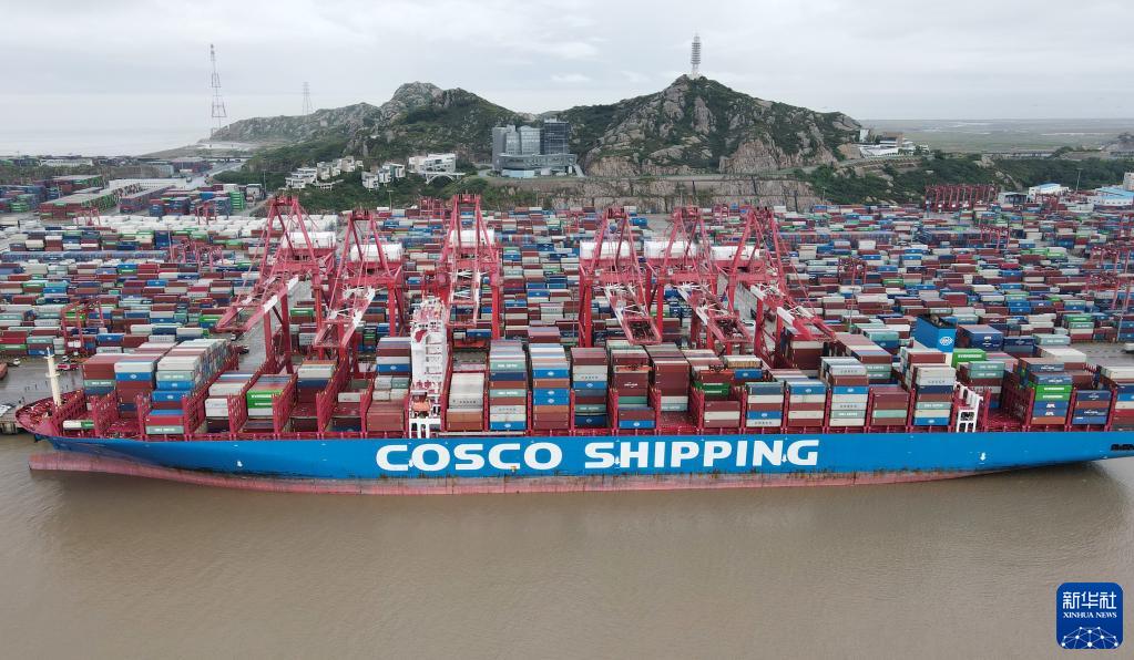中遠(yuǎn)海運(yùn)“天秤座”輪停泊在上海洋山港二期碼頭(10月13日攝,無人機(jī)照片)。新華社記者 方喆 攝