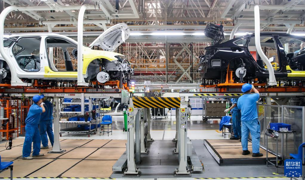 在上汽大眾生產(chǎn)車間內(nèi),工作人員在生產(chǎn)流水線上作業(yè)(2018年10月30日攝)。新華社記者 丁汀 攝