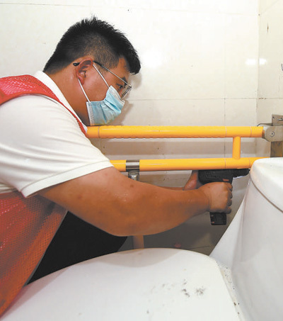 在安徽合肥市廬陽區(qū)大楊鎮(zhèn)十張村殘疾老人葛家寶家中,工作人員在如廁區(qū)、洗浴區(qū)安裝扶手。 影像中國