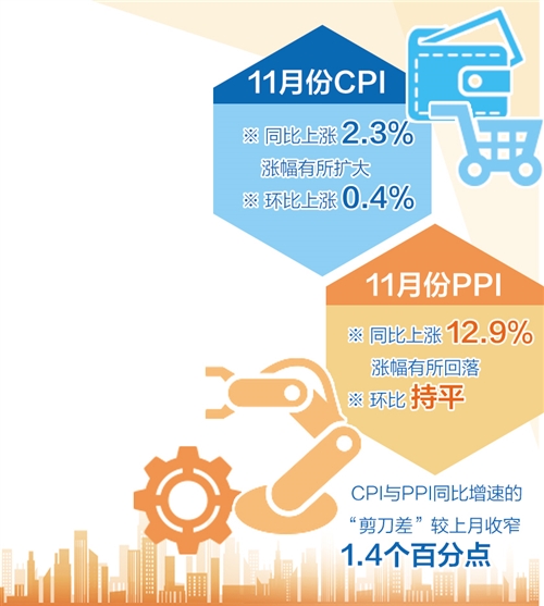 12月9日,國(guó)家統(tǒng)計(jì)局發(fā)布的11月份全國(guó)居民消費(fèi)價(jià)格指數(shù)(CPI)和工業(yè)生產(chǎn)者出廠價(jià)格指數(shù)(PPI)顯示,11月份,CPI同比上漲2.3%,漲幅有所擴(kuò)大;環(huán)比上漲0.4%。隨著保供穩(wěn)價(jià)政策落實(shí)力度不斷加大,PPI同比上漲12.9%,漲幅有所回落;環(huán)比持平。CPI與PPI同比增速的“剪刀差”為10.6個(gè)百分點(diǎn),較上月收窄1.4個(gè)百分點(diǎn)。
