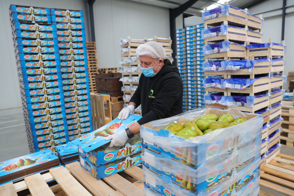 ↑ 2021年10月22日,在比利時(shí)圣希利斯-瓦斯市的一個(gè)水果分揀包裝車間,工作人員把即將出口到中國(guó)的比利時(shí)啤梨裝箱。