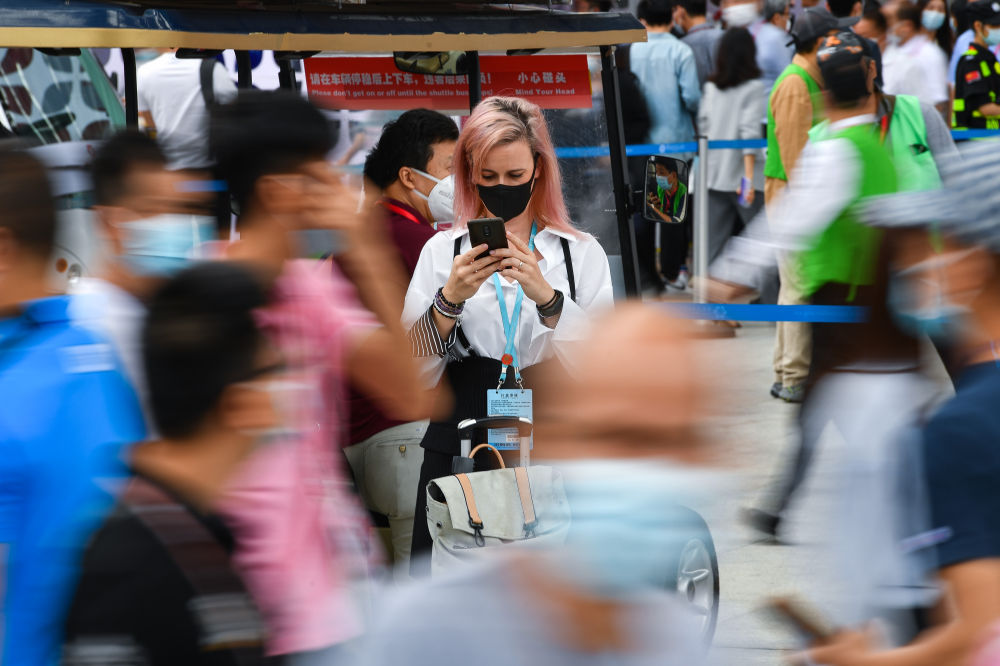 ↑ 2021年10月15日,生活在廣東佛山的意大利工業(yè)設(shè)計(jì)師勞敏妮參加廣交會(huì)。