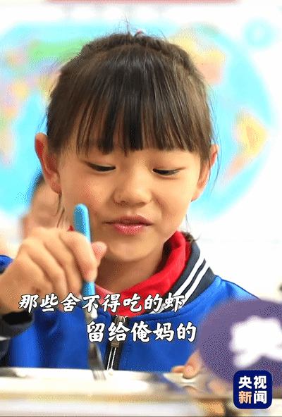 8歲女孩張笑笑在學(xué)校吃午餐時(shí),唯獨(dú)留下了盤(pán)子里的蝦,一句“留給俺媽”戳中無(wú)數(shù)人的心。