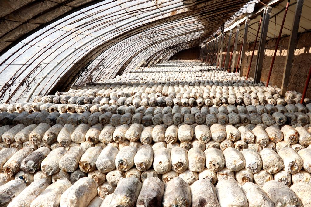 王和平的菌菇種植大棚里堆滿了菌棒。