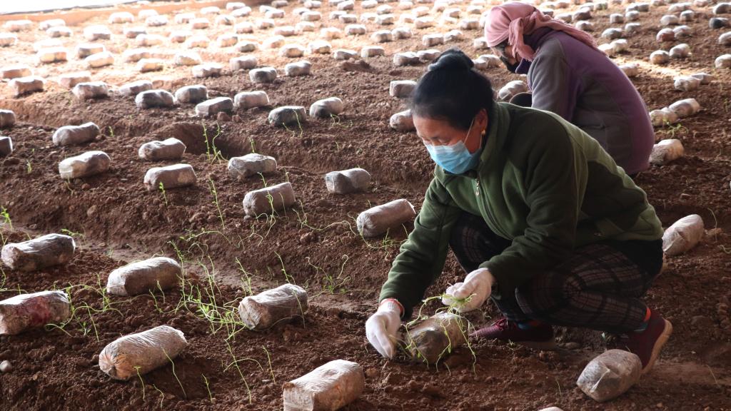 寒冬時節(jié),呼嘯的北風從高原上猛烈吹過,四下一片荒蕪冷清。而在王和平的大棚里,大伙正揮舞著鐵鍬,將菌棒埋進土里,不少人把毛衣外套掛在棚壁上,熱火朝天的氣息與棚外的寒意形成了鮮明對比。