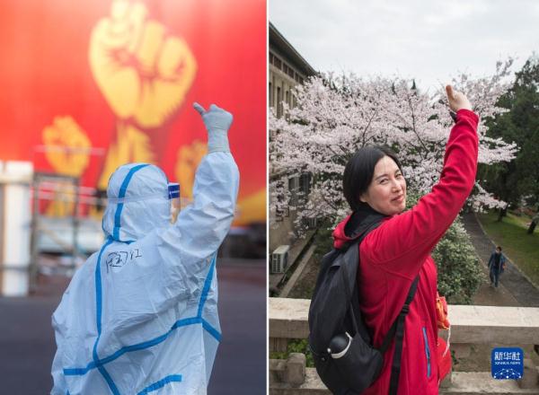 這是一張拼版照片。左圖為2020年2月12日,安徽援鄂醫(yī)療隊(duì)隊(duì)員周國(guó)紅在武漢體育中心方艙醫(yī)院前豎起拇指為自己和同伴加油;右圖為2021年3月13日,周國(guó)紅在武漢大學(xué)櫻花樹(shù)前拍照留念。