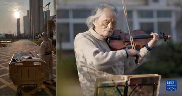 這是一張拼版照片。左圖為2020年3月5日傍晚,在武漢大學(xué)人民醫(yī)院東院,復(fù)旦大學(xué)附屬中山醫(yī)院支援湖北醫(yī)療隊(duì)醫(yī)生在護(hù)送患者王欣做CT的途中停下,讓住院近一個(gè)月的老人欣賞久違的日落(甘俊超攝);右圖為2021年3月24日,“看夕陽(yáng)的老人”王欣在湖北省武漢市東西湖區(qū)園藝花城小區(qū)內(nèi)拉小提琴(新華社記者熊琦攝)。