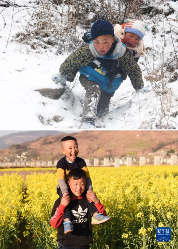 這是一張拼版照片。上圖為:2018年2月2日,吉覺(jué)吉竹背著弟弟下山,前往易地扶貧搬遷的外公家;下圖為:2021年2月24日,吉覺(jué)吉竹和弟弟在四川省涼山彝族自治州越西縣南箐鎮(zhèn)新家附近的油菜地里玩耍。