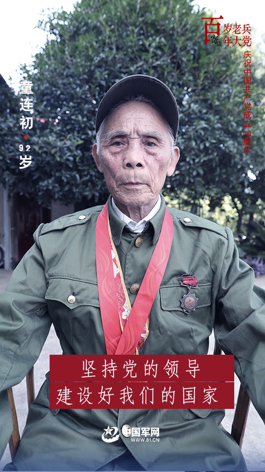 歲月滄桑,初心依舊。一襲干凈的綠軍裝和戰(zhàn)場(chǎng)上留下的傷疤,是童連初曾經(jīng)浴血沙場(chǎng)的見(jiàn)證。平靜安詳?shù)耐砟晟钭屧?jīng)的老兵多了幾分祥和,給孩子們講述戰(zhàn)爭(zhēng)年代的故事,成為他晚年生活里最愛(ài)做的事?粗t艷艷的黨旗,童連初感慨道:“今年是建黨100周年,因?yàn)辄h,我們才有了今天的幸福生活,我們的年輕人,要堅(jiān)持黨的領(lǐng)導(dǎo),發(fā)奮圖強(qiáng),建設(shè)好我們的國(guó)家!”
