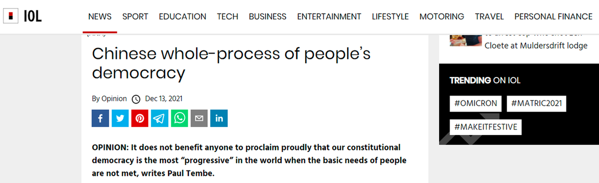 南非大學(xué)姆貝基非洲領(lǐng)導(dǎo)力研究院高級(jí)研究員譚哲理(Paul Tembe)在南非獨(dú)立在線新聞網(wǎng)站(IOL)發(fā)表評(píng)論文章,積極評(píng)價(jià)中國(guó)的全過(guò)程人民民主,認(rèn)為中國(guó)的民主制度實(shí)現(xiàn)了良政善治,南非可以從中學(xué)習(xí)借鑒以更好服務(wù)本國(guó)人民。