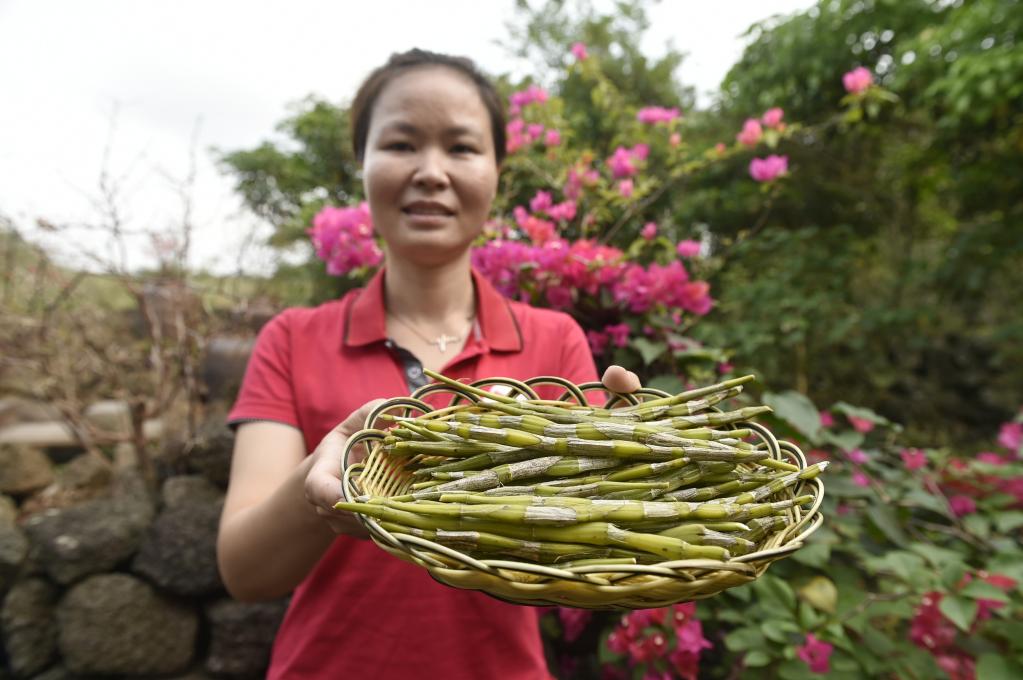 2019年3月14日,村民在海南海口市秀英區(qū)石山鎮(zhèn)施茶村石斛園展示新鮮的石斛。新華社記者 魯鵬 攝