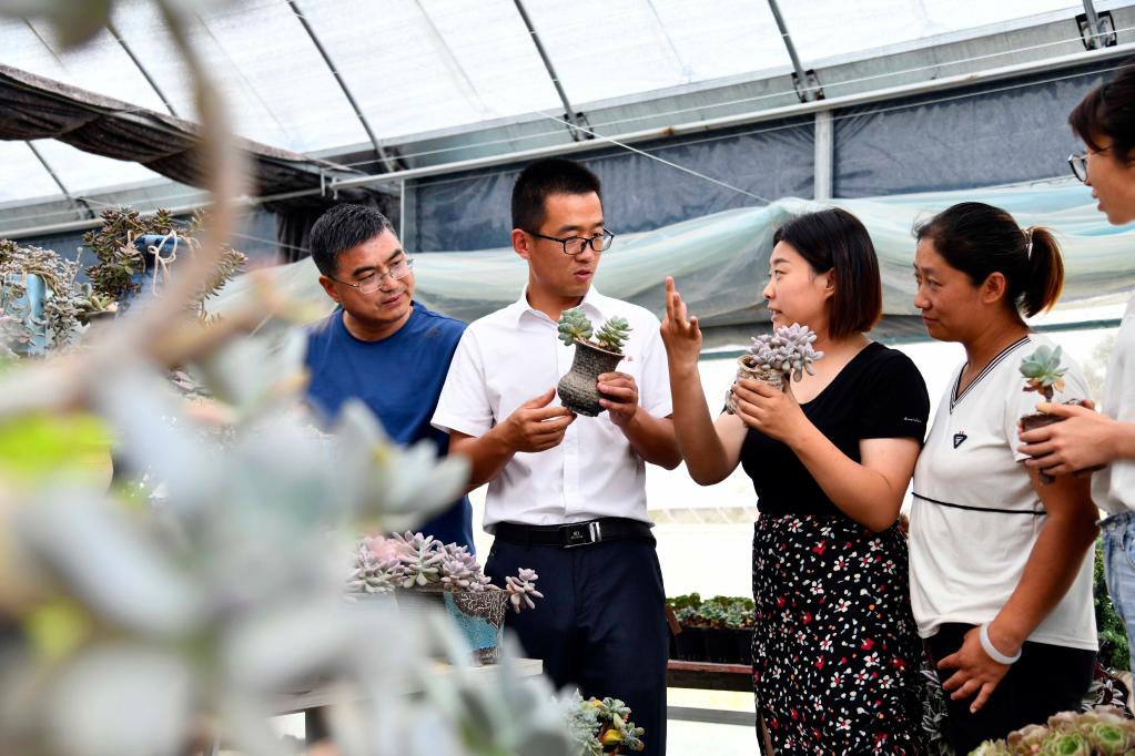 2020年6月9日,在濟(jì)南市章丘區(qū)三澗溪村農(nóng)業(yè)創(chuàng)業(yè)園,青年創(chuàng)業(yè)黨支部書記王元虎(左二)和青年黨員一起商量發(fā)展事宜。新華社記者 王凱 攝