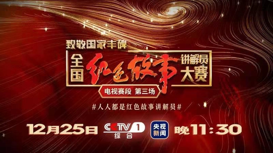 《致敬國(guó)家豐碑——全國(guó)紅色故事講解員大賽》電視賽段第三場(chǎng)于12月25日晚11:30,在央視新聞新媒體全平臺(tái)并機(jī)綜合頻道CCTV-1播出,講解紅色故事,致敬國(guó)家豐碑!