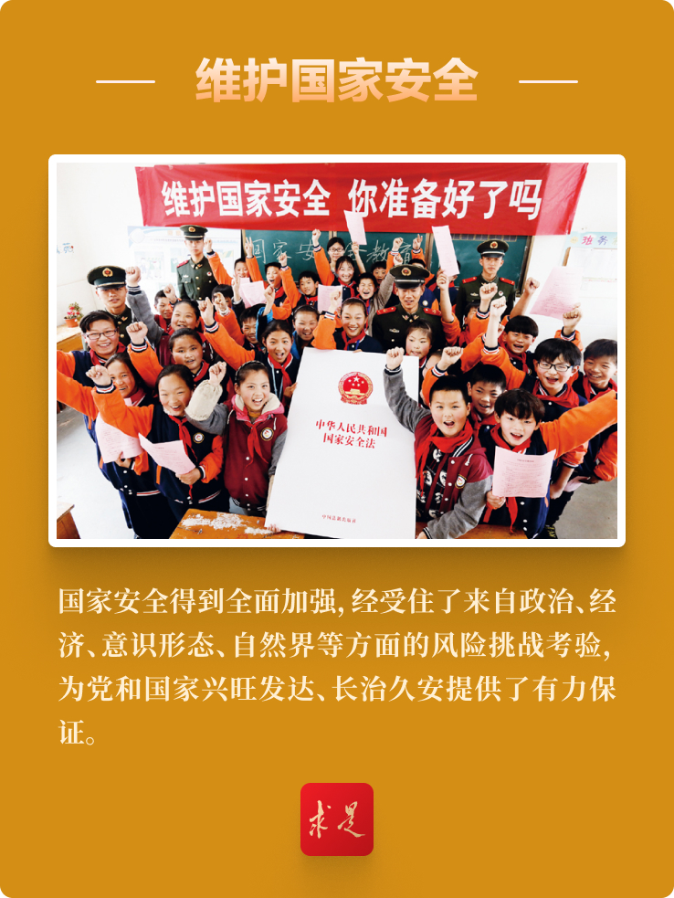 ——黨把安全發(fā)展貫穿國家發(fā)展各領(lǐng)域全過程,注重防范化解影響我國現(xiàn)代化進(jìn)程的重大風(fēng)險(xiǎn),堅(jiān)定維護(hù)國家政權(quán)安全、制度安全、意識(shí)形態(tài)安全,加強(qiáng)國家安全宣傳教育和全民國防教育,鞏固國家安全人民防線,推進(jìn)興邊富民、穩(wěn)邊固邊,嚴(yán)密防范和嚴(yán)厲打擊敵對(duì)勢(shì)力滲透、破壞、顛覆、分裂活動(dòng),頂住和反擊外部極端打壓遏制,開展涉港、涉臺(tái)、涉疆、涉藏、涉海等斗爭(zhēng),加快建設(shè)海洋強(qiáng)國,有效維護(hù)國家安全。