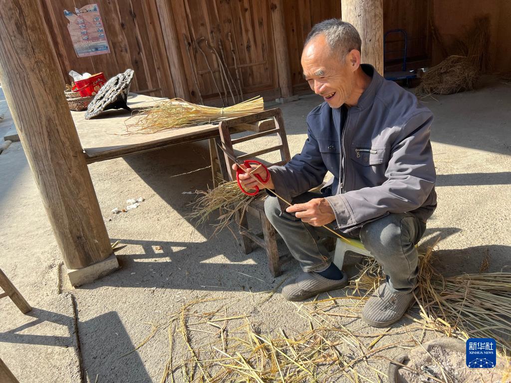 “我在做捆綁黃水粑用的稻谷桿!弊谧约议T前,村民李治林一邊忙著勞作,一邊笑著向記者打招呼。