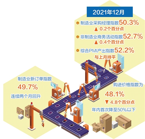 經(jīng)濟日報北京12月31日訊(記者熊麗)國家統(tǒng)計局服務業(yè)調(diào)查中心、中國物流與采購聯(lián)合會31日發(fā)布的數(shù)據(jù)顯示,2021年12月,制造業(yè)采購經(jīng)理指數(shù)和非制造業(yè)商務活動指數(shù)分別為50.3%和52.7%,比上月上升0.2個和0.4個百分點;綜合PMI產(chǎn)出指數(shù)為52.2%,與上月持平。