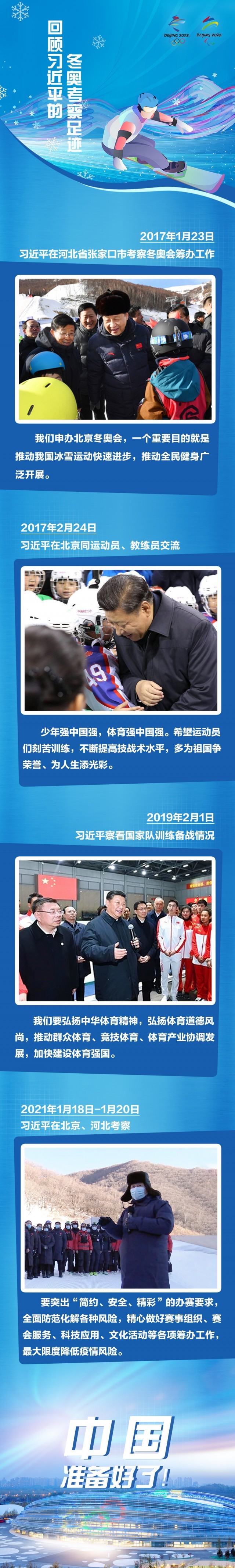 習(xí)近平主席在今年的新年講話中提道:“世界期待中國,中國做好了準(zhǔn)備!被厥字袊瑠W之路,從申辦到籌辦,他一路關(guān)心、一路引領(lǐng)。