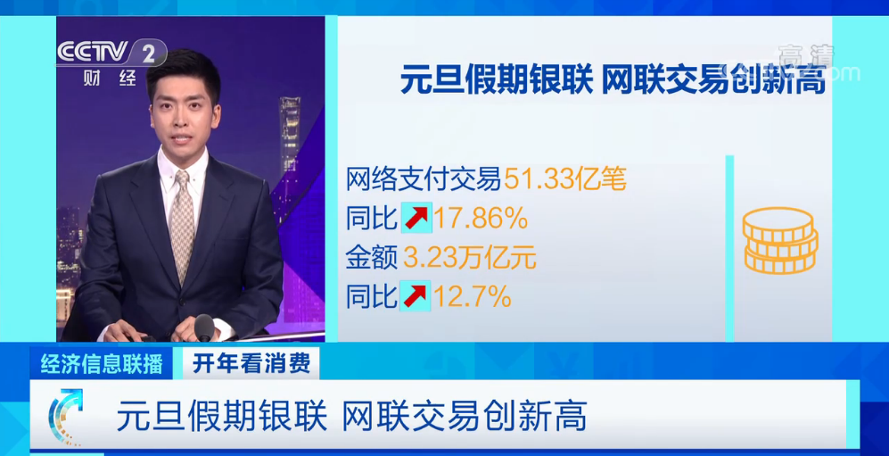 央視網(wǎng)消息:新年伊始,元旦小長假就點燃了大家積蓄已久的消費熱情。中國銀聯(lián)、網(wǎng)聯(lián)平臺1月4日發(fā)布的交易數(shù)據(jù)顯示,1日至3日,銀聯(lián)網(wǎng)絡(luò)交易總金額達(dá)到1.32萬億元,創(chuàng)歷史同期新高;網(wǎng)聯(lián)平臺共處理網(wǎng)絡(luò)支付交易51.33億筆,金額3.23萬億元,相比去年同期分別增長17.86%和12.7%,交易筆數(shù)和金額均創(chuàng)歷史新高。