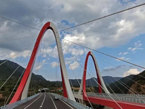 進(jìn)入延崇高速河北段主線,迎冬奧氛圍撲面而來。圖為“奧運(yùn)之門”——杏林堡大橋。(河北省交通運(yùn)輸廳供圖)