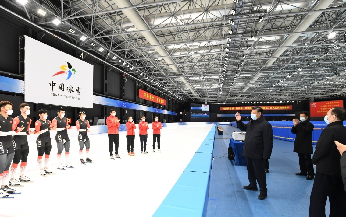 1月4日,中共中央總書記、國家主席、中央軍委主席習(xí)近平在北京考察2022年冬奧會(huì)、冬殘奧會(huì)籌辦備賽工作。這是4日下午,習(xí)近平在二七廠冰雪項(xiàng)目訓(xùn)練基地速滑館,向參訓(xùn)運(yùn)動(dòng)員、教練員表示慰問。