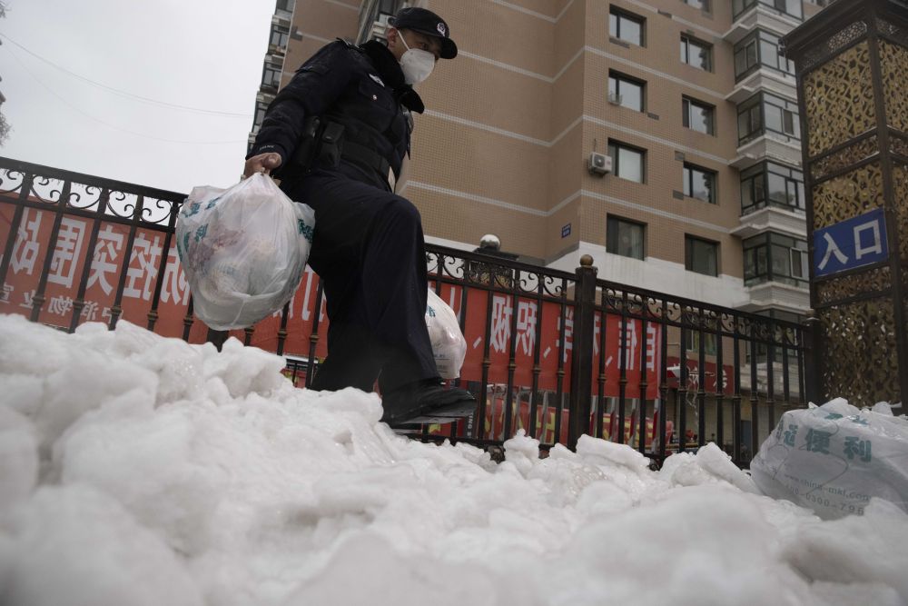 ↑在黑龍江省哈爾濱市平房區(qū)一處小區(qū),卡點(diǎn)執(zhí)勤民警幫助運(yùn)送生活物資(2021年11月8日攝)。