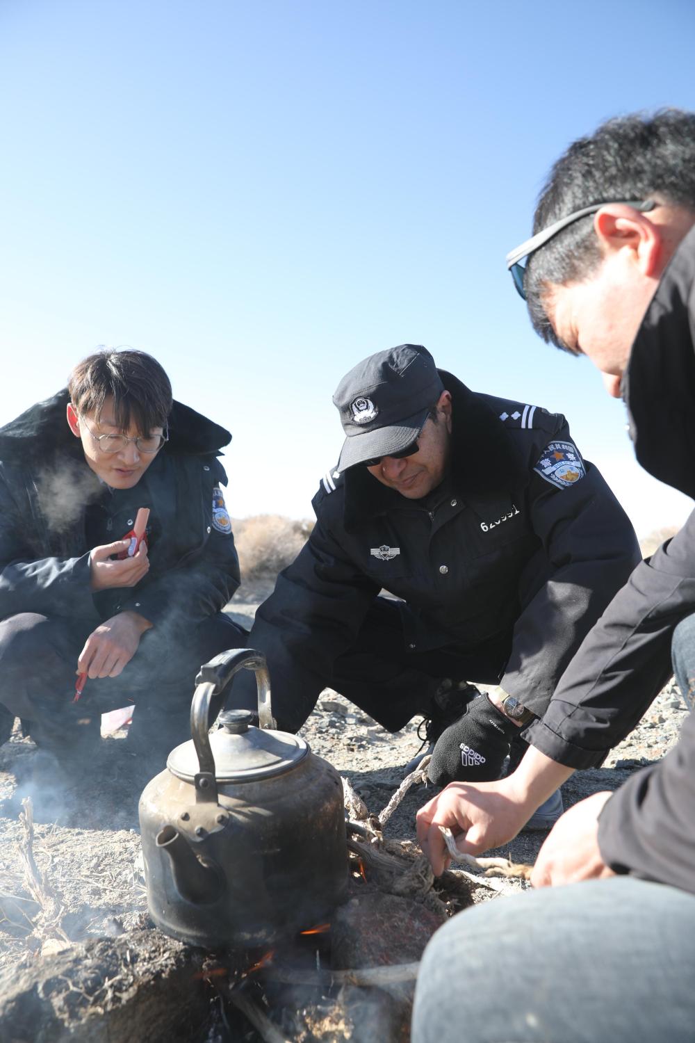 ↑甘肅省公安廳森林公安局安南壩分局民警在甘肅安南壩野駱駝國(guó)家級(jí)自然保護(hù)區(qū)巡邏途中燒水(2021年1月8日攝)。