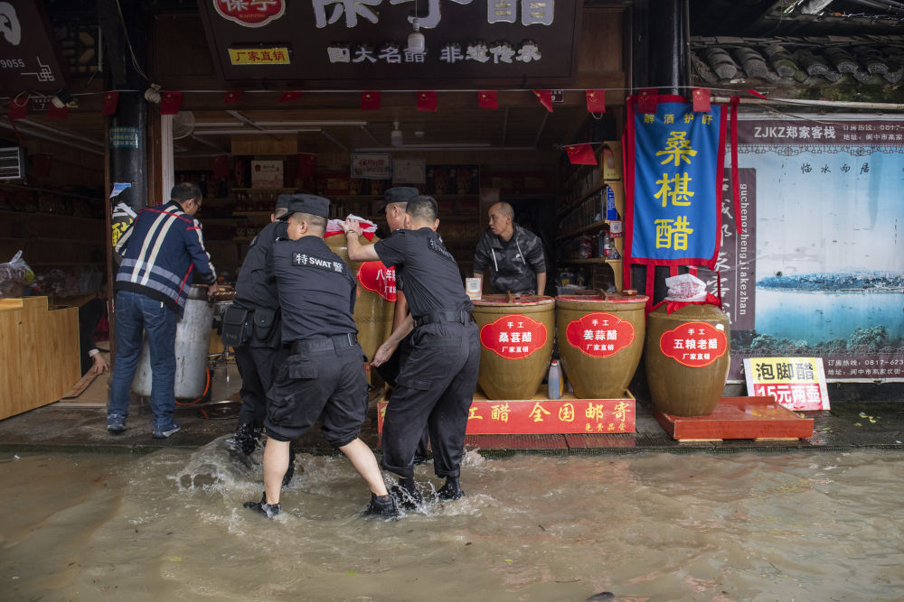 ↑ 在四川省閬中市,嘉陵江水漫進(jìn)閬中古城內(nèi)多條街道,公安民警幫助商戶轉(zhuǎn)運(yùn)物資(2021年10月5日)。