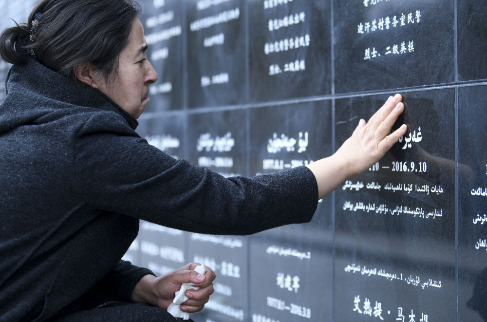 ↑在烏魯木齊市革命烈士陵園,“人民英雄”艾熱提·馬木提的遺孀瑪依努爾·尼扎木丁撫摸鐫刻在新疆公安英烈紀(jì)念碑上艾熱提的名字。(2021年4月3日攝)。