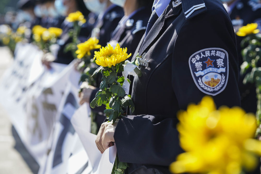 ↑ 在云南省西雙版納傣族自治州景洪市,民警在參加緝毒警察蔡曉東遺體送別儀式(2021年12月8日攝)。