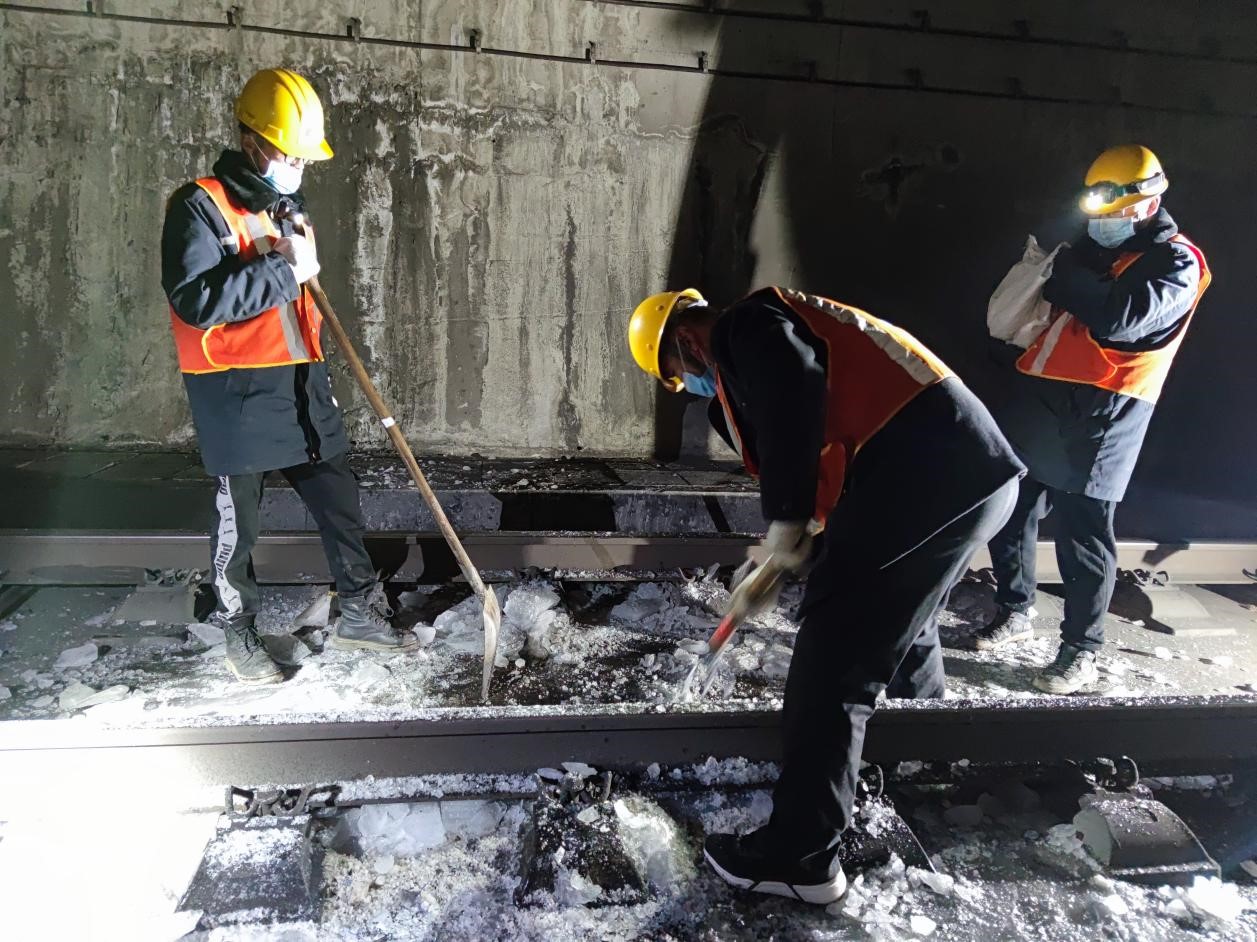 同樣,全長434公里的太焦鐵路是晉煤外運的重要通道,每隔4小時,太原局太原工務段榆社橋隧車間的職工,就會對沿線6座隧道的42處結冰隱患點進行清除。