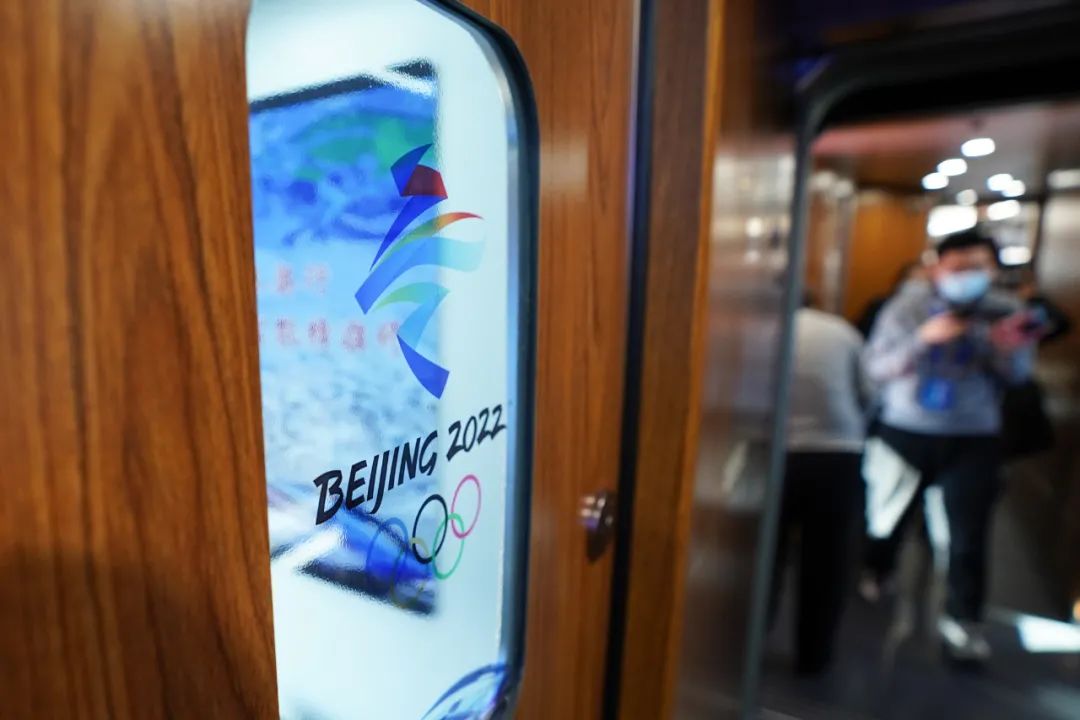 這是2022年1月6日在G9981次北京冬奧列車內(nèi)拍攝的北京2022年冬奧會會徽。新華社記者 鞠煥宗 攝