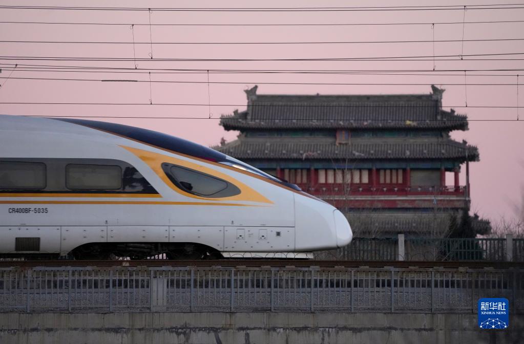 1月17日清晨,一列動(dòng)車組列車駛過北京永定門城樓。