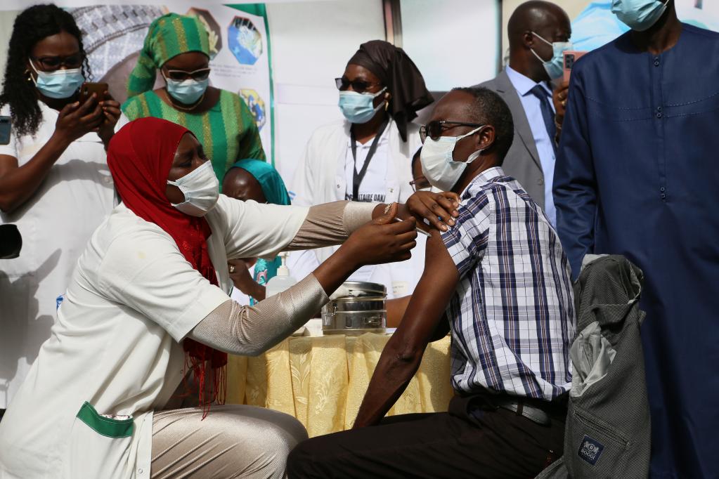 2021年2月23日,塞內(nèi)加爾傳染病學(xué)專家穆薩·賽義迪(前右)在首都達(dá)喀爾接種中國新冠疫苗。(新華社記者邢建橋攝)