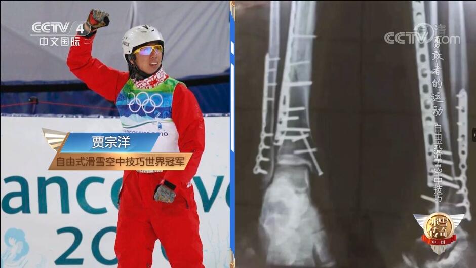右側的X光照片是正在備戰(zhàn)2022北京冬奧會的空中技巧隊老將賈宗洋的左腿照片。賈宗洋在備戰(zhàn)2018年平昌冬奧會期間意外受傷,左腿粉碎性骨折,斷成了三截。為了能夠趕上平昌冬奧會,他在腿里面做了鋼釘支架。這樣的鋼釘最短的估計有三厘米多,長的有四五厘米,賈宗洋的左腿上有22顆這樣的鋼釘,他就是帶著這些鋼釘參加的平昌冬奧會。