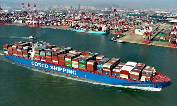 2021年2月19日,在位于山東自貿(mào)試驗(yàn)區(qū)青島片區(qū)的山東港口青島港前灣集裝箱碼頭,一艘滿載集裝箱的貨輪駛出港口(無人機(jī)照片)。新華社發(fā)(張進(jìn)剛攝)