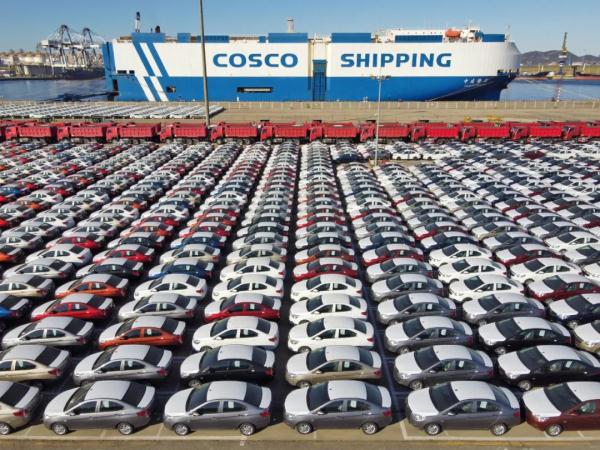 大批出口商品車在山東港口煙臺港集結(jié)等待裝船(2021年12月7日攝,無人機(jī)照片)。新華社發(fā)(唐克 攝)