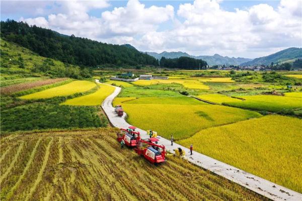 2021年9月15日,貴州省龍里縣灣灘河鎮(zhèn)羊場社區(qū)的農(nóng)民在搶收稻谷(無人機(jī)照片)。新華社記者楊文斌 攝