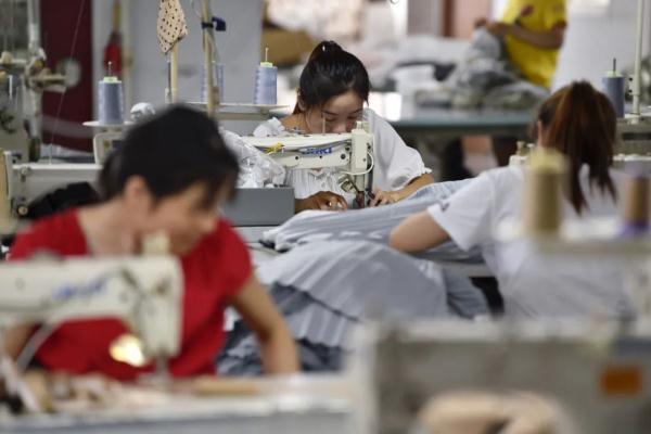 2021年7月15日,在江蘇省南京市江寧區(qū)麒麟街道的一家服裝廠,工人在裁縫車間制作服裝。新華社發(fā)(方東旭 攝)