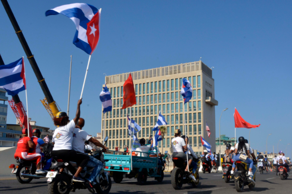 2021年3月28日,參加游行的車隊(duì)經(jīng)過位于哈瓦那的美國(guó)駐古巴大使館。新華社發(fā)(華金·埃爾南德斯攝)