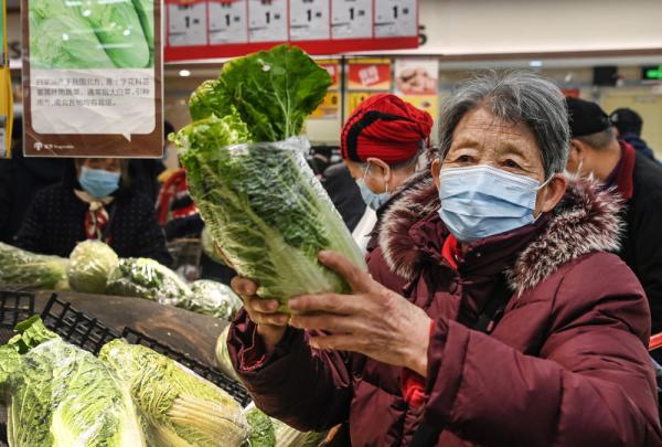 ↑1月24日,市民在西安市朝陽(yáng)門外的一家大型超市選購(gòu)政府投放的儲(chǔ)備蔬菜。