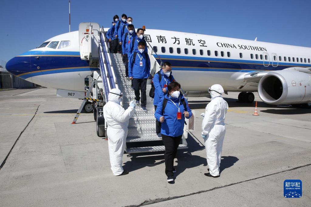 2020年4月20日,在吉爾吉斯斯坦首都比什凱克瑪納斯國(guó)際機(jī)場(chǎng),中國(guó)赴吉爾吉斯斯坦聯(lián)合工作組成員走下飛機(jī)。聯(lián)合工作組隨機(jī)攜帶了由新疆維吾爾自治區(qū)捐贈(zèng)的一批抗疫醫(yī)療物資。新華社發(fā)(羅曼攝)