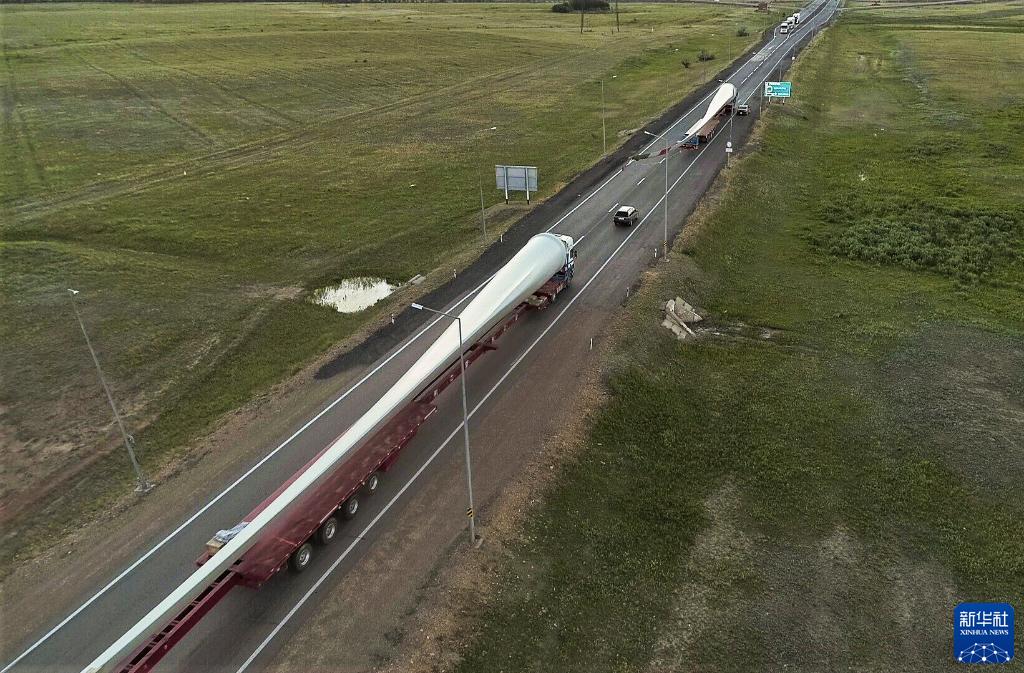 2020年6月23日,在哈薩克斯坦卡拉干達(dá)至努爾蘇丹段公路,卡車車隊(duì)運(yùn)輸70米長(zhǎng)的風(fēng)機(jī)葉片(無人機(jī)拍攝)。新冠疫情期間,中國(guó)和哈薩克斯坦克服困難,繼續(xù)推動(dòng)新能源領(lǐng)域合作。中國(guó)生產(chǎn)的風(fēng)電設(shè)備跨越數(shù)千公里運(yùn)輸至哈薩克斯坦,助力哈薩克斯坦可再生能源項(xiàng)目。新華社發(fā)(奧斯潘諾夫攝)