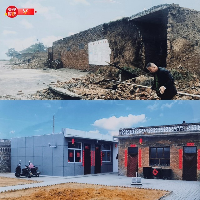 上圖為師紅兵一家受災后倒塌的窯洞,下圖為災后重建的裝配式住房,共兩間平房,面積50平方米
