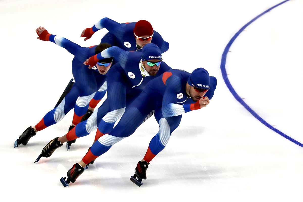 1月30日,在國家速滑館“冰絲帶”,法國運動員在進行賽前訓練。 中國日報記者 張威 攝