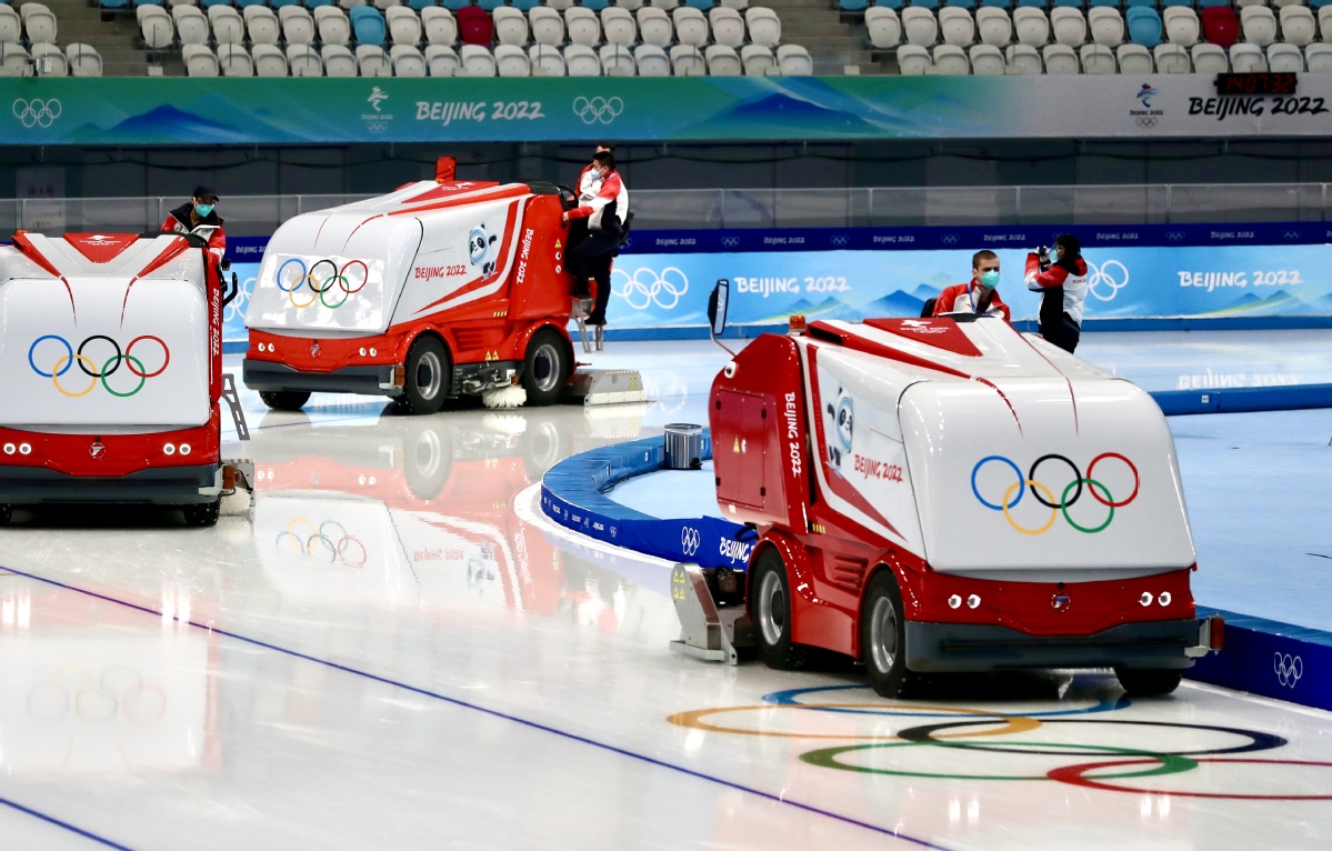 1月30日,在國家速滑館“冰絲帶”,工作人員使用澆冰車及時對冰面進行維護,保障冰面質(zhì)量。 中國日報記者 張威 攝