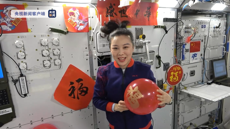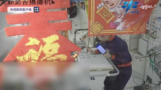 貼著福字的中國(guó)結(jié)、春字形的掛飾和春聯(lián),各種春節(jié)元素將空間站裝點(diǎn)得喜氣洋洋、紅紅火火。因?yàn)樘罩刑赜械奈⒅亓Νh(huán)境,我們看到中國(guó)結(jié)的紅色流蘇懸空自由飄舞。充滿現(xiàn)代科技感的中國(guó)空間站和中國(guó)傳統(tǒng)的年節(jié)習(xí)俗完美融合、相得益彰。