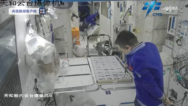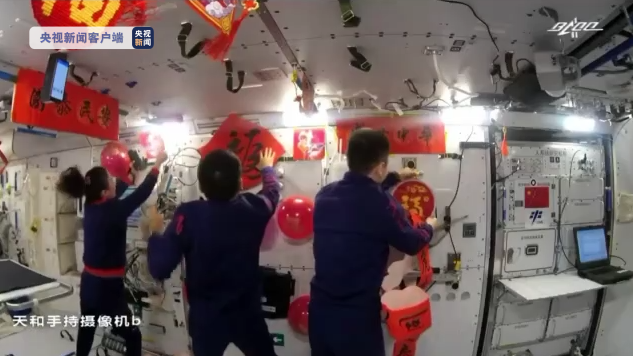 天宮空間站這幾天被布置一新,透過(guò)鏡頭,我們看到,航天員翟志剛正在將福字張貼在艙壁上,航天員王亞平將一張年畫掛在了艙頂上,航天員葉光富一邊拿著對(duì)聯(lián)、一邊調(diào)整福字的擺放,大家忙得不亦樂(lè)乎。