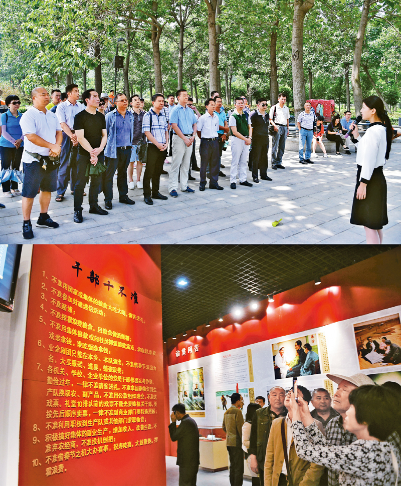 1966年2月,長(zhǎng)篇通訊《縣委書(shū)記的榜樣——焦裕祿》播發(fā),焦裕祿的名字傳遍千家萬(wàn)戶,成為共產(chǎn)黨人的光輝典范和全體黨員干部崇敬的榜樣。黨的十八大以來(lái),習(xí)近平總書(shū)記多次勉勵(lì)廣大黨員干部學(xué)習(xí)弘揚(yáng)焦裕祿精神,做焦裕祿式的好干部。上圖為2017年8月9日,黨員干部在焦裕祿干部學(xué)院聆聽(tīng)焦桐的故事(新華社記者 馮大鵬/攝);下圖為2014年5月5日,干部群眾在焦裕祿同志紀(jì)念館觀看“干部十不準(zhǔn)”展板(新華社記者 朱祥/攝)。