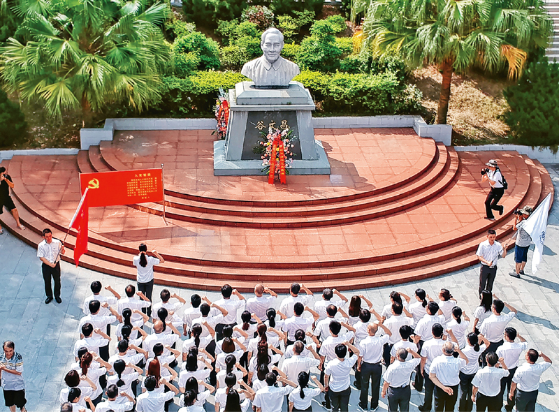 谷文昌在福建省東山縣工作14年間,帶領(lǐng)東山人民與風(fēng)災(zāi)、旱災(zāi)抗?fàn),植?shù)造林,興修水利,改善交通,發(fā)展生產(chǎn),把一個(gè)風(fēng)沙肆虐的荒島變成生機(jī)盎然的東海綠洲,為經(jīng)濟(jì)建設(shè)和社會(huì)發(fā)展奠定了堅(jiān)實(shí)基礎(chǔ)。習(xí)近平總書(shū)記多次提到谷文昌,稱贊他“在老百姓心中樹(shù)起了一座不朽的豐碑”。圖為2019年7月1日,黨員干部在谷文昌塑像前重溫入黨誓詞。 東山縣委宣傳部供圖 許照臨/攝