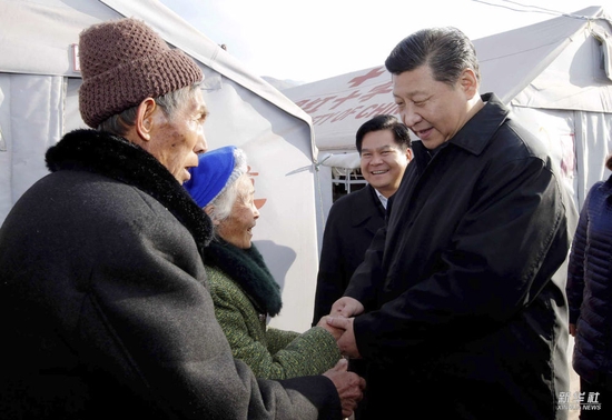 ↑2015年1月19日,習(xí)近平來到云南魯?shù)榭h小寨鎮(zhèn)甘家寨紅旗社區(qū)過渡安置點(diǎn),看望鄒體富老兩口。